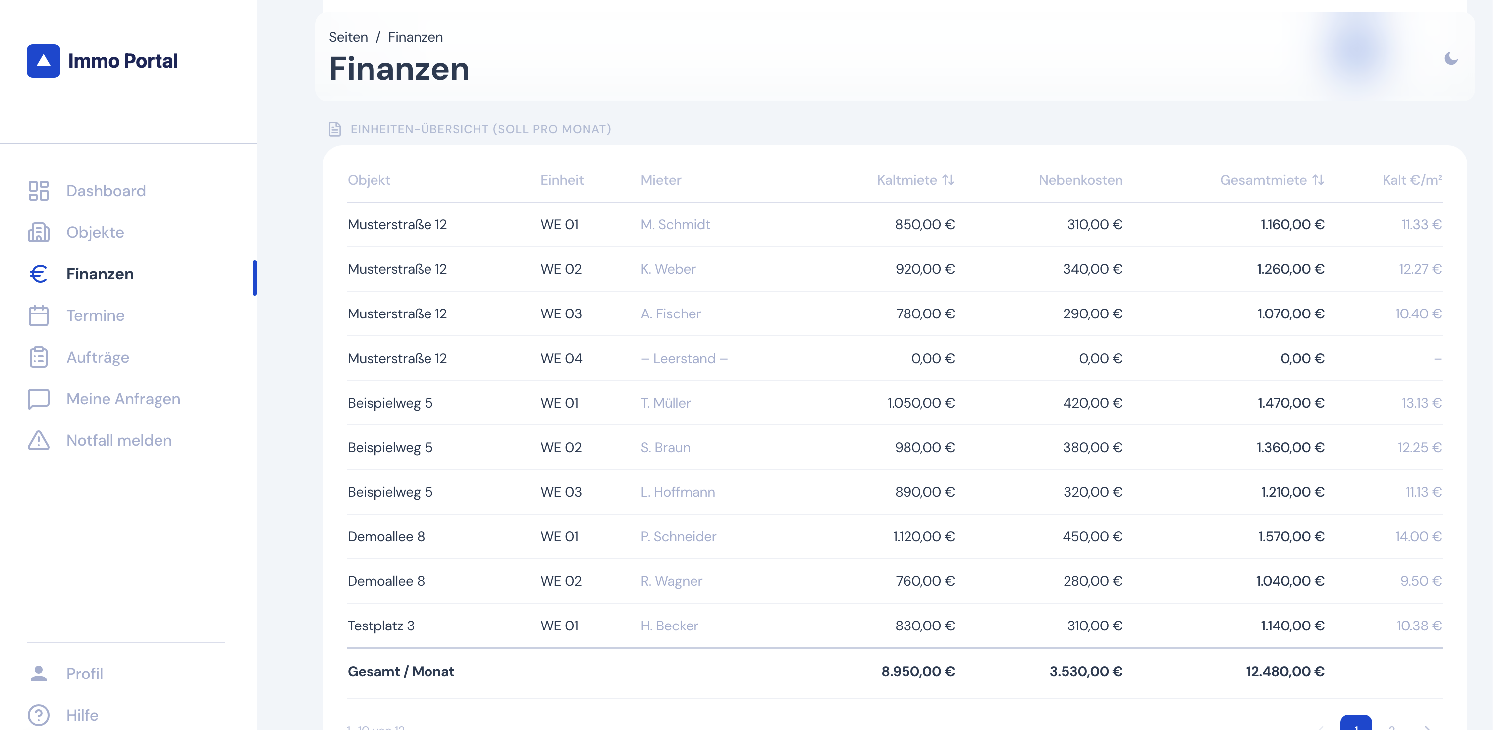 Finanz-Dashboard für Immobilienverwaltung. Echtzeit-Übersicht über Mieteinnahmen, Ausgaben und Kostenverteilung pro Objekt mit interaktiven Charts.