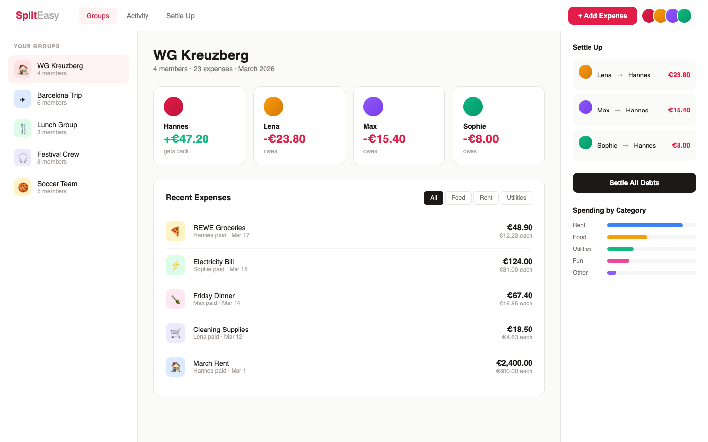 Ausgaben-Splitter für Gruppen und WGs. Echtzeit-Synchronisation, smarte Schuldenoptimierung und übersichtliche Abrechnungshistorie.
