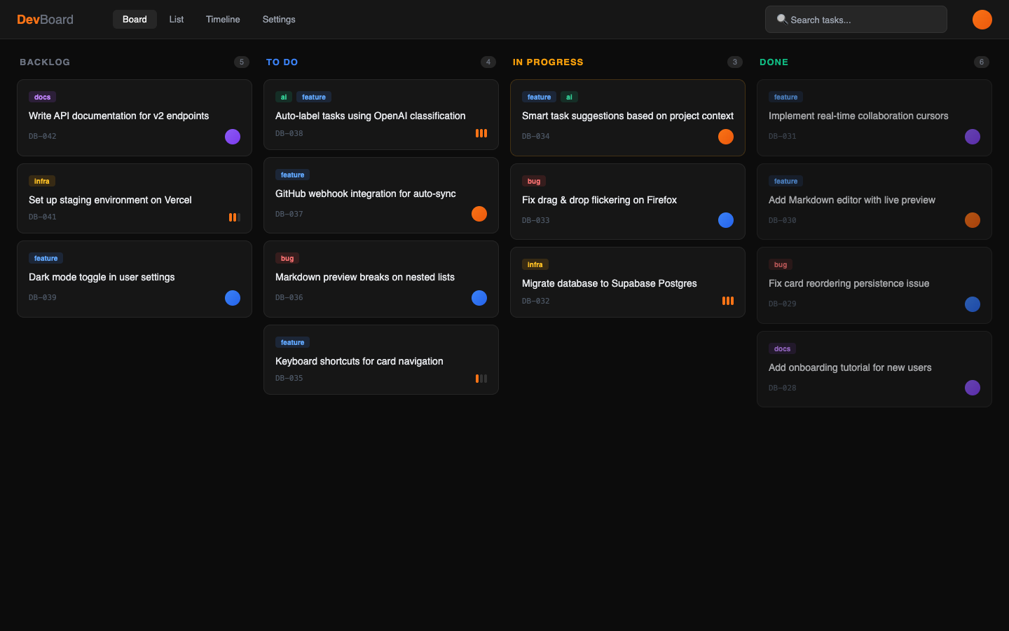 Persönliches Kanban-Board für Entwickler. Markdown-Support, GitHub-Integration und automatische Labels durch KI-gestützte Kategorisierung von Tasks.