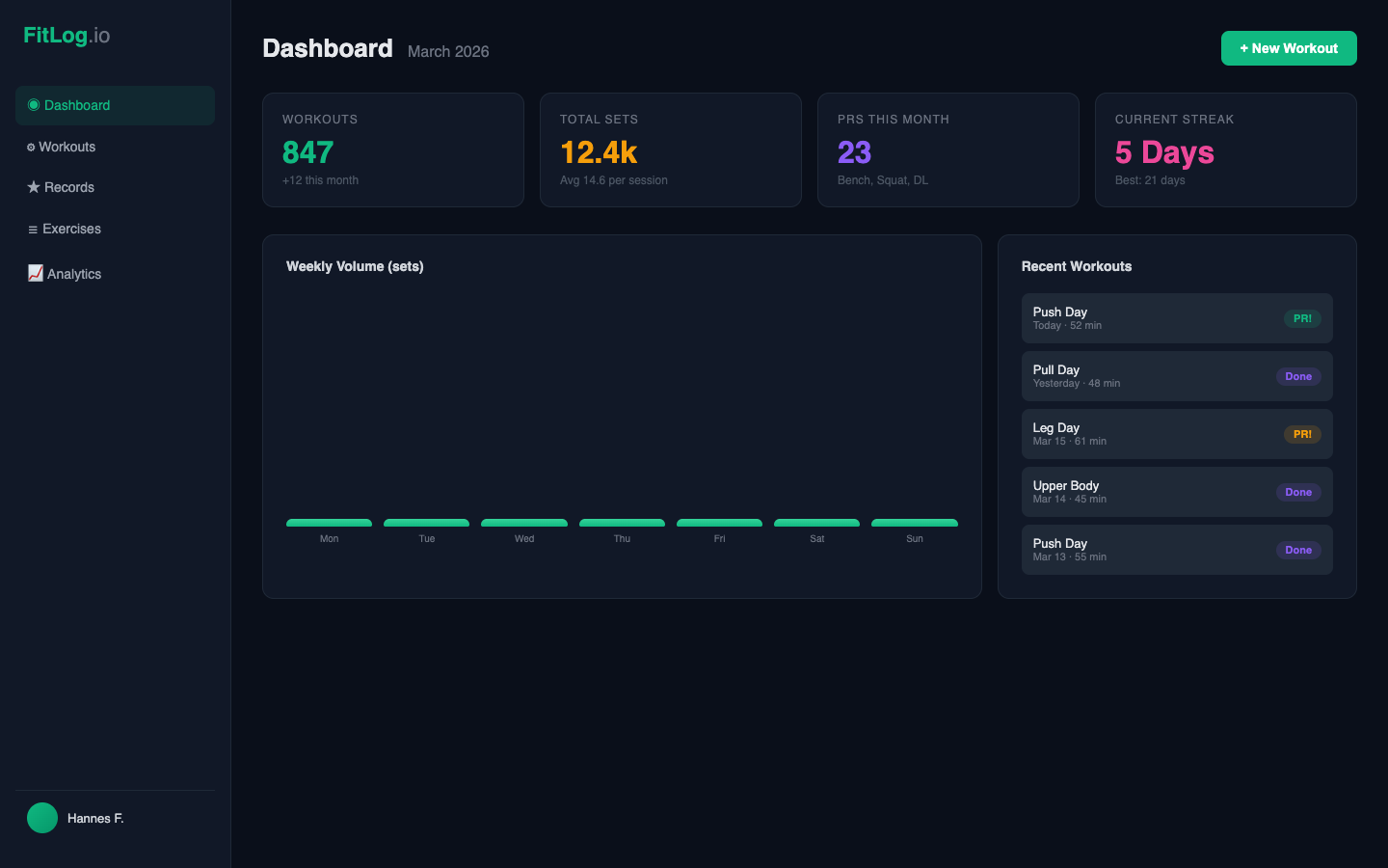 Workout-Tracker mit Fortschrittsanalyse und persönlichen Rekorden. Intuitive Eingabe, Statistiken über Zeit und automatische Trainingsvorschläge basierend auf Historie.