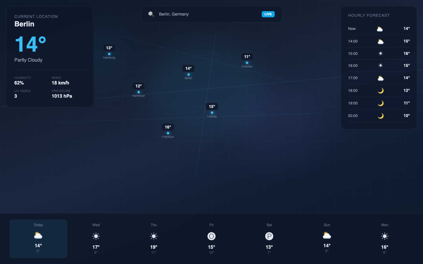 Interaktive Wetter-App mit Kartenansicht und 7-Tage-Vorhersage. Standortbasiert mit animierten Wetter-Overlays und historischen Vergleichsdaten.